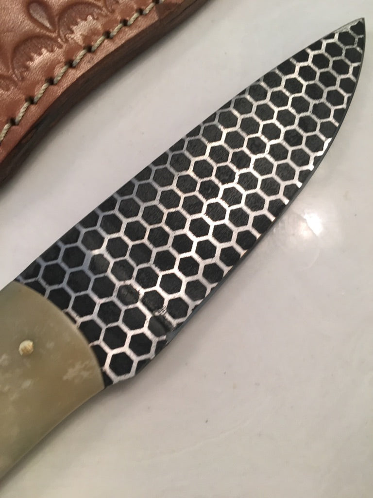 Custom Camel Bone handle with a 1095 steel Honeycomb pattern blade. Blade measures 3 inches. Handle has a lanyard hole with a leather strap. Camel Bone handle has an unique look. Blade made and signed SM by Stephen Mann. Knife designed by JL Coy of China Spring, Texas. Custom horizontal leather sheath with belt loop included.