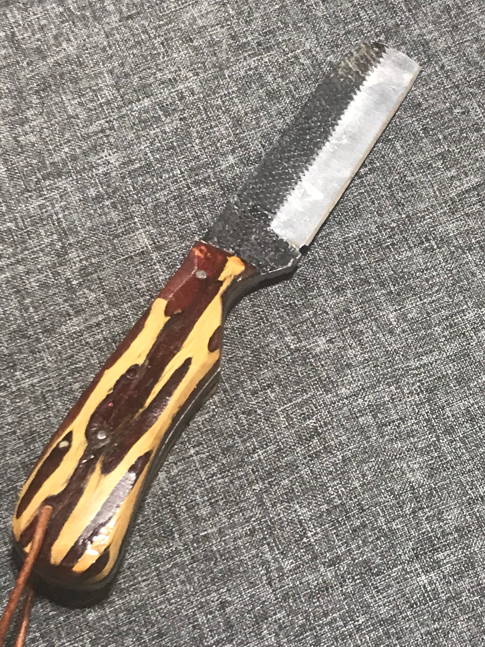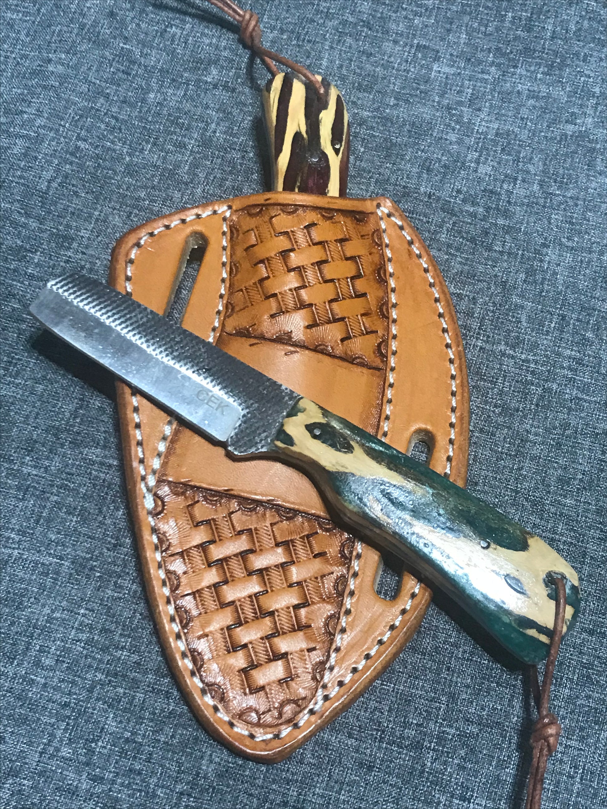 Custom Cholla Cactus handle with a 2.75 inch D2 steel blade. Cactus is embedded in an epoxy resin. handle measures 3 inches long. Knife comes with a custom leather sheath. Blade design by Cutting Edge Knife -signed CEK.. Custom handmade leather sheath included (45.00 value)