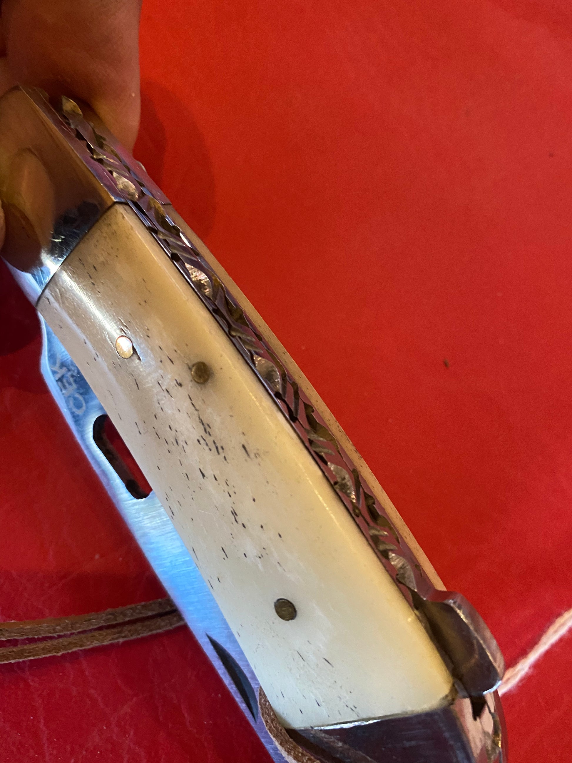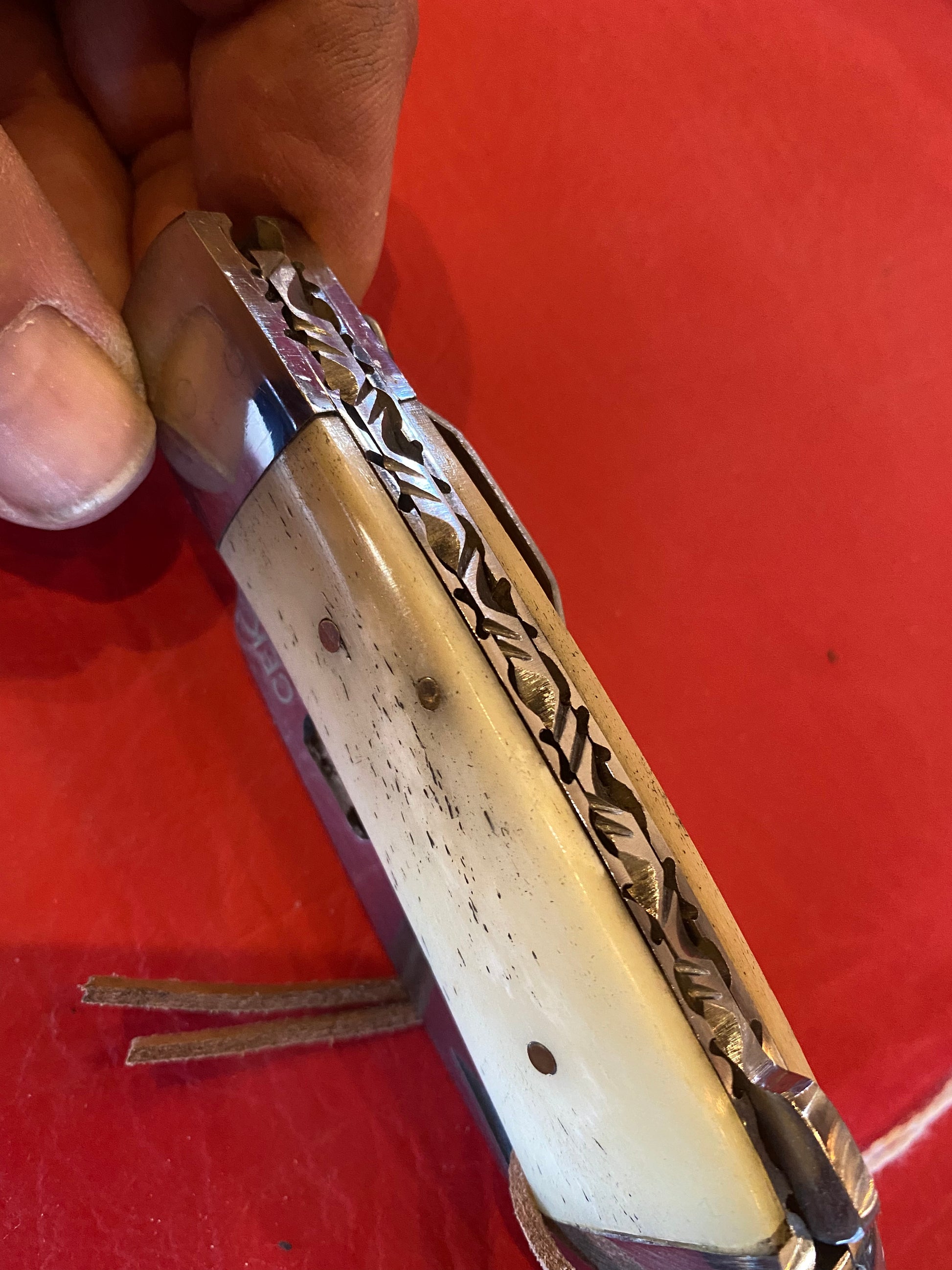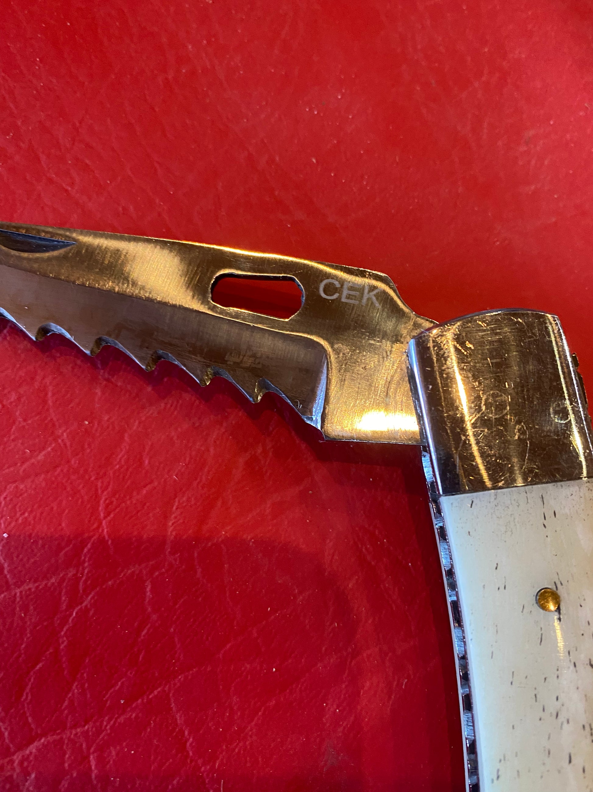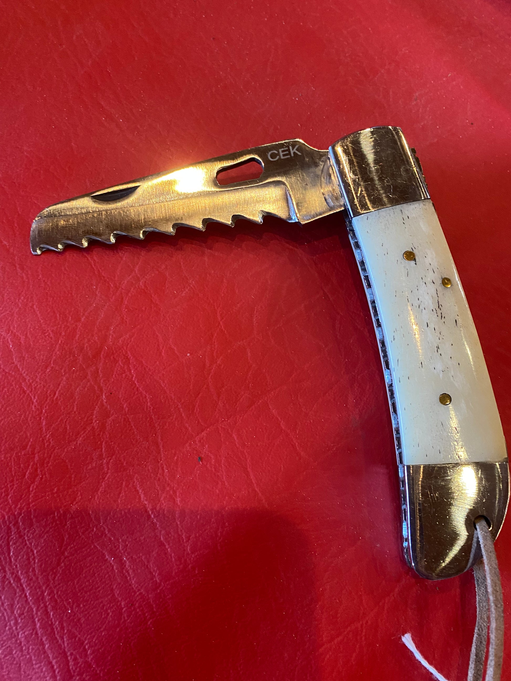 Custom bone handle folding knife with a 3 1/2 inch D2 full shark teeth serrated blade with a pin lock system that is very easy to manipulate. Serrated blade is a roping cutting sharp blade. Pocket clip model with file work on the handle spine .