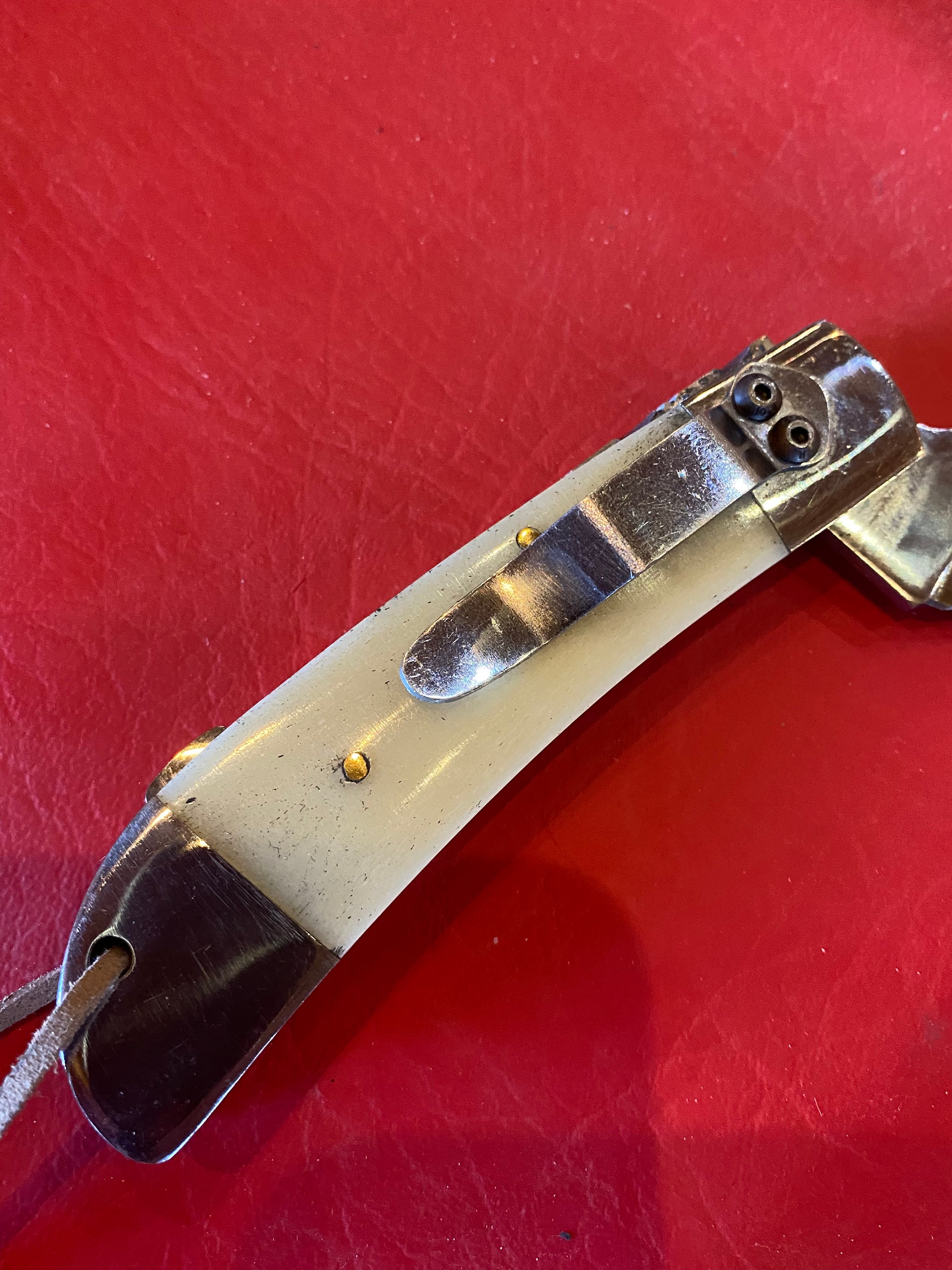 FD-032 Custom Bone Full Serrated Raised Button Release Folding Knife
