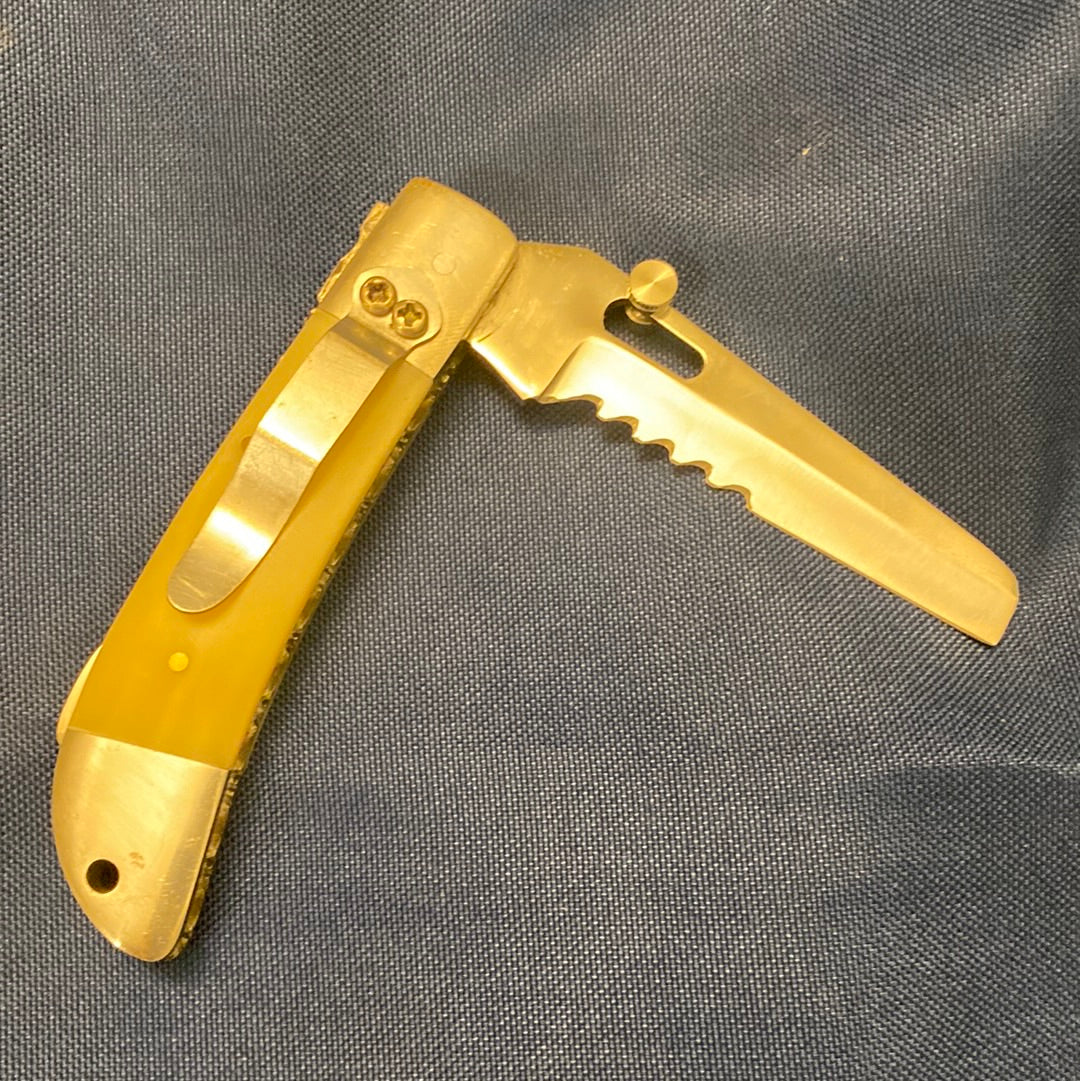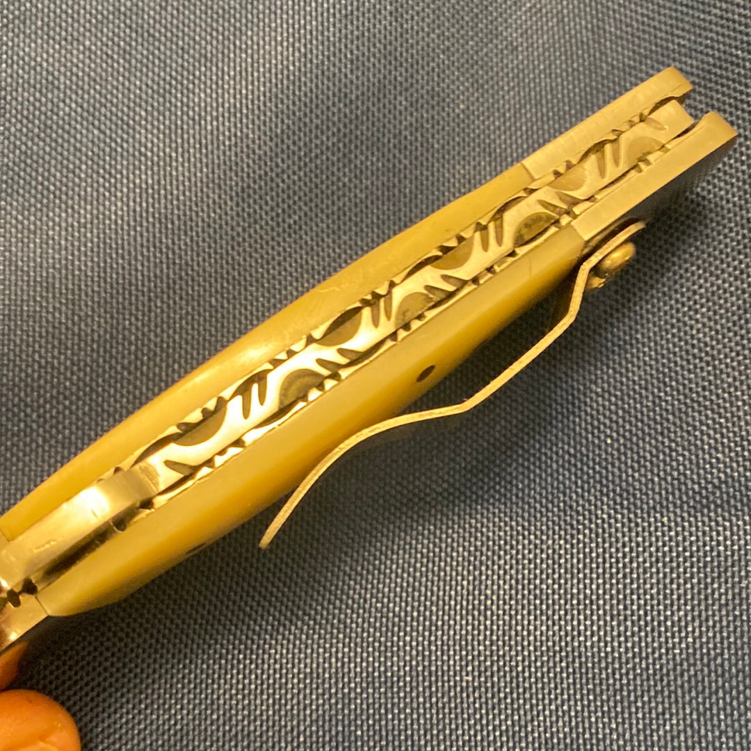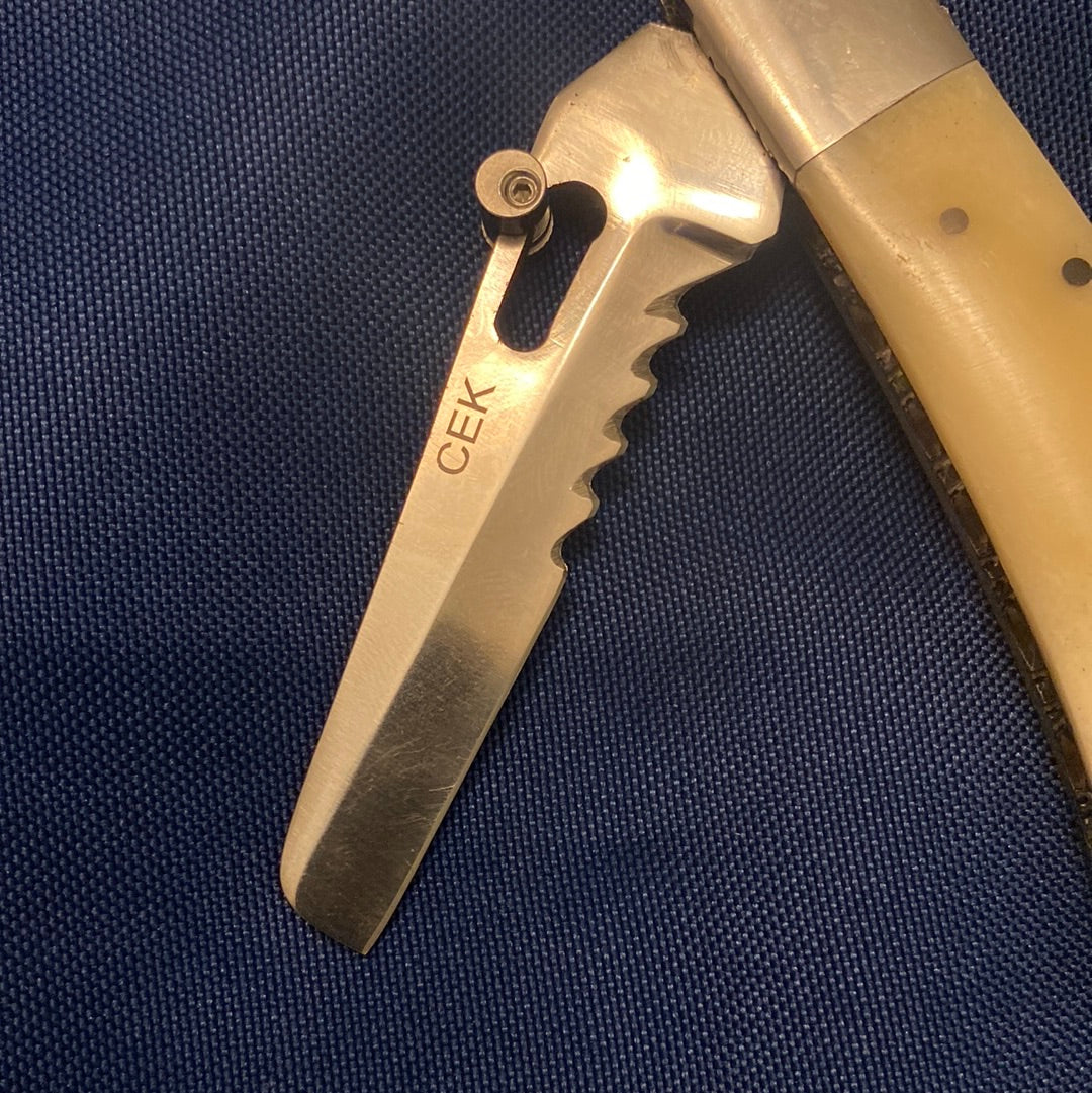 This Custom designed knife comes in a semi serrated 3.75 inch D 2 blade with a 3.75 inch hand-crafted handle made of bone. Pocket clip and thumb stub model.. This knife has nice file work on the spine of the handle raised release button