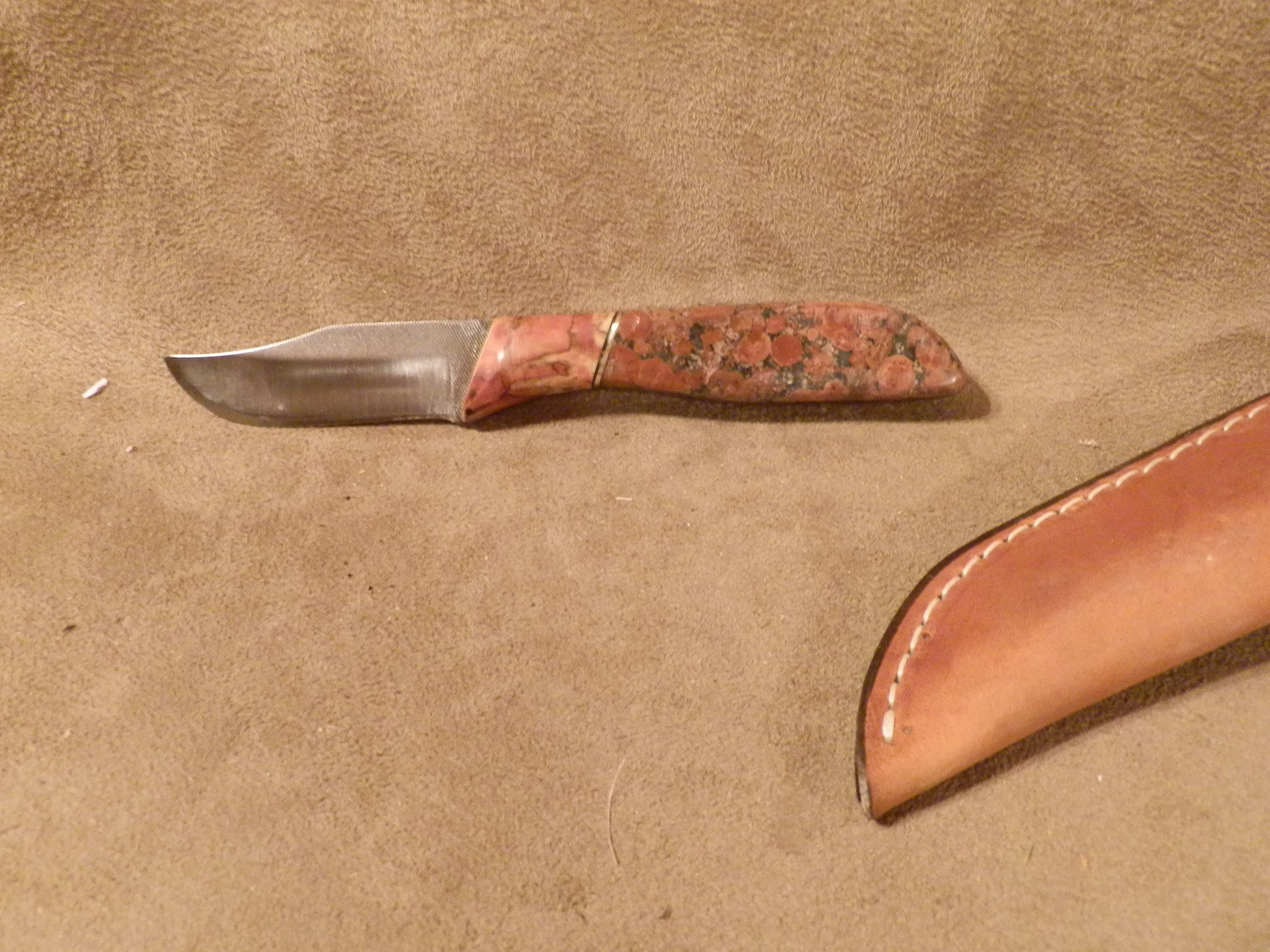 Custom Red Poppy Jasper handle knife with a 2.5 inch steel file blade made from a tempered 1095 rasp file. Handle measures approx. 4 inches. 56 to 58 HRC on Rockwell Hardness scale. leather sheath with belt loop included,.