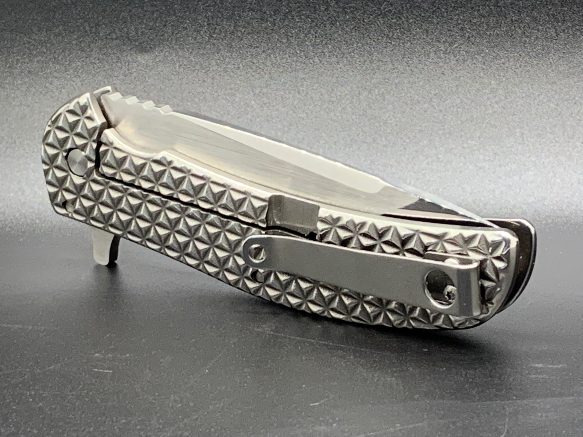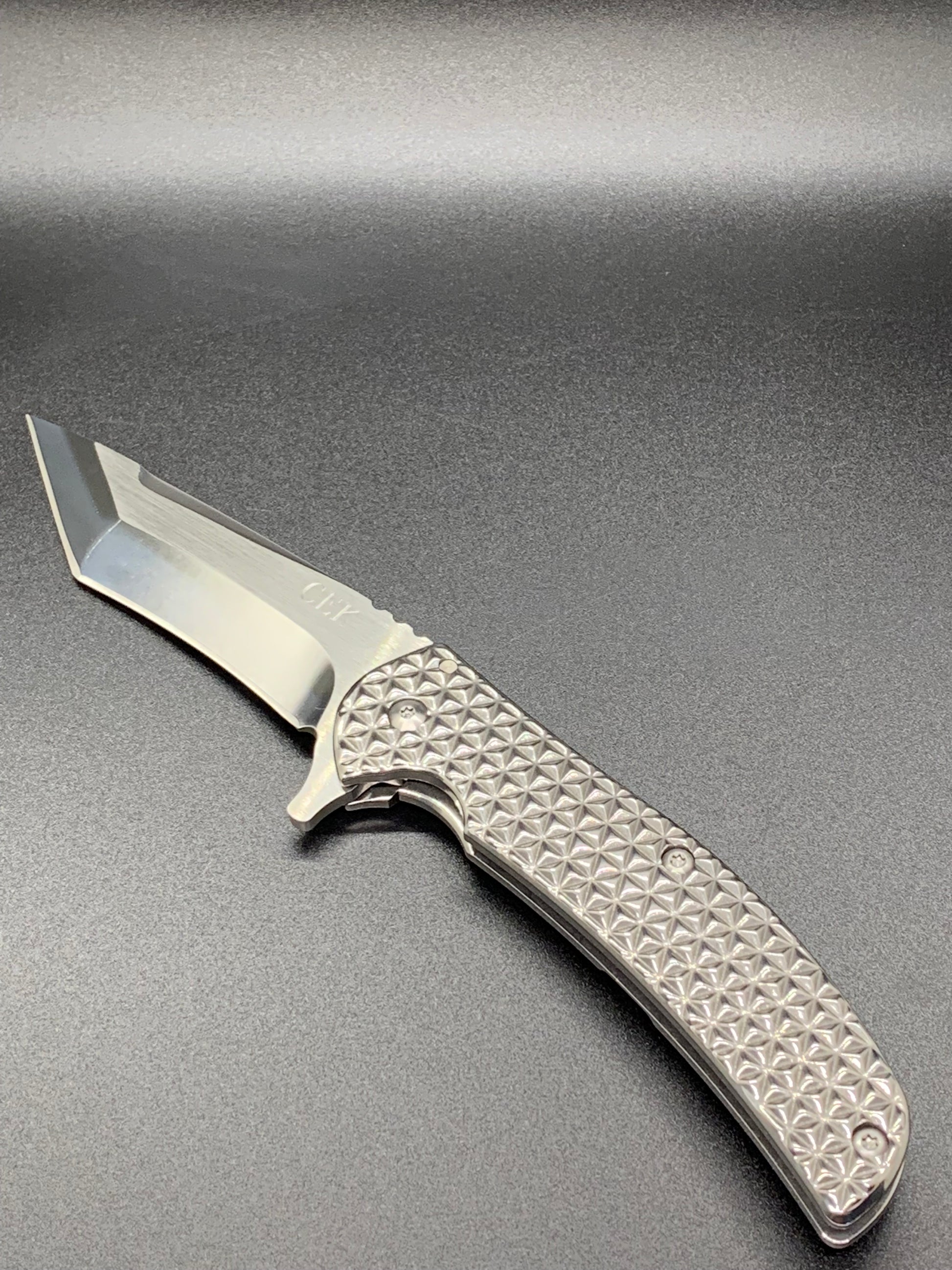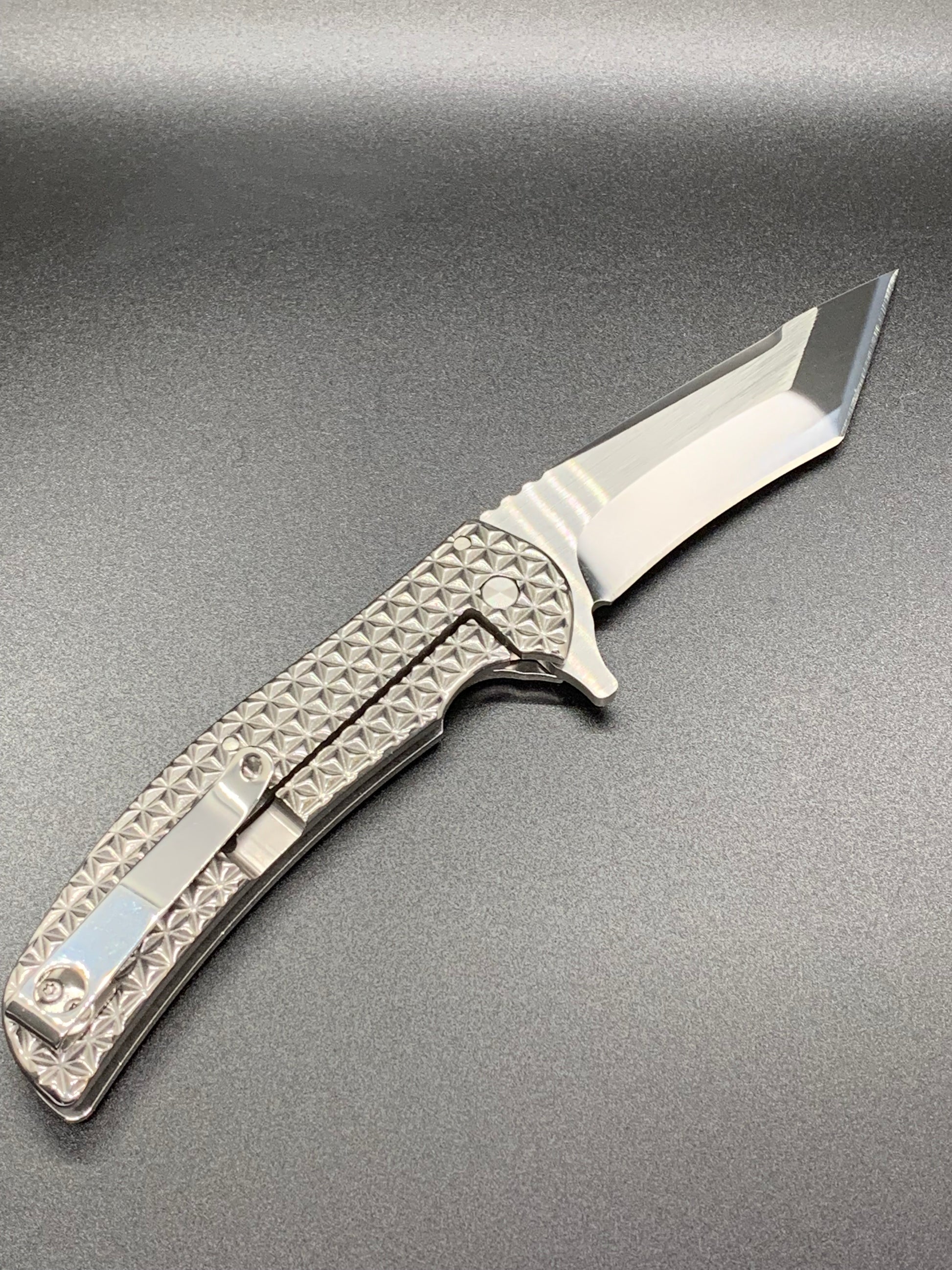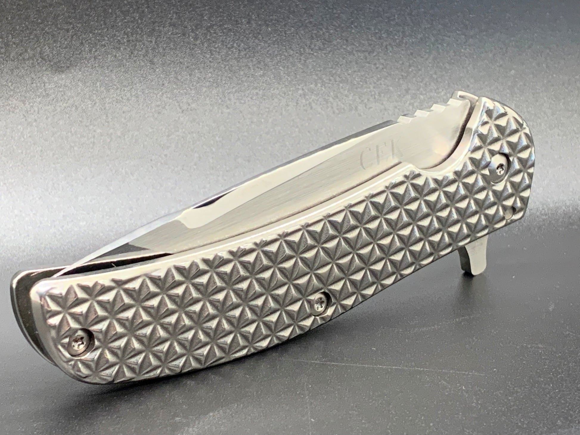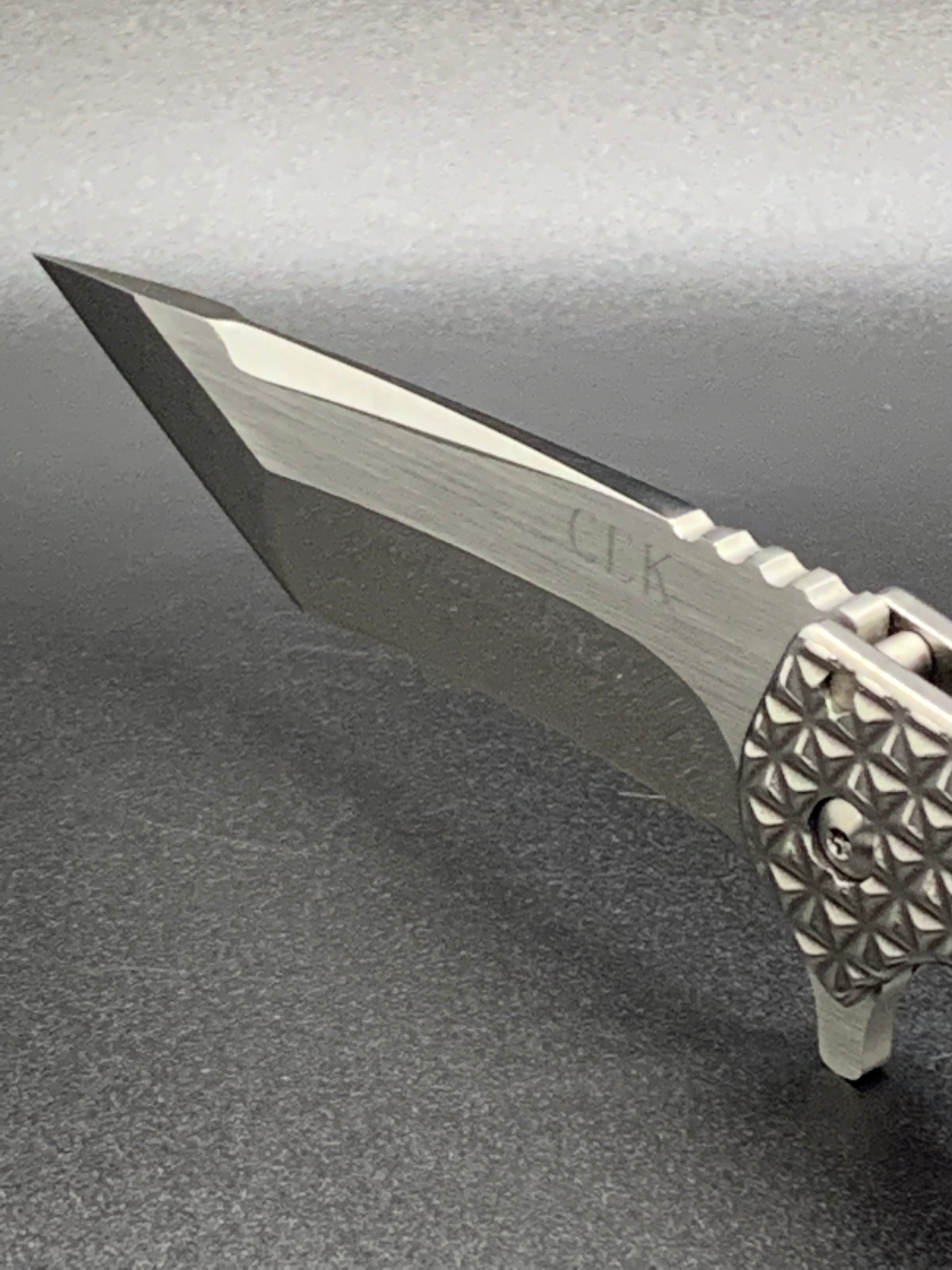 CEK custom designed and handcrafted this beautiful Diamond Plate stainless steel handle folder that measures 4.5 inches in length. The handle supports a full tang , Tanto style blade, and was made with 440c stainless steel and measures 3.5 inches in length.