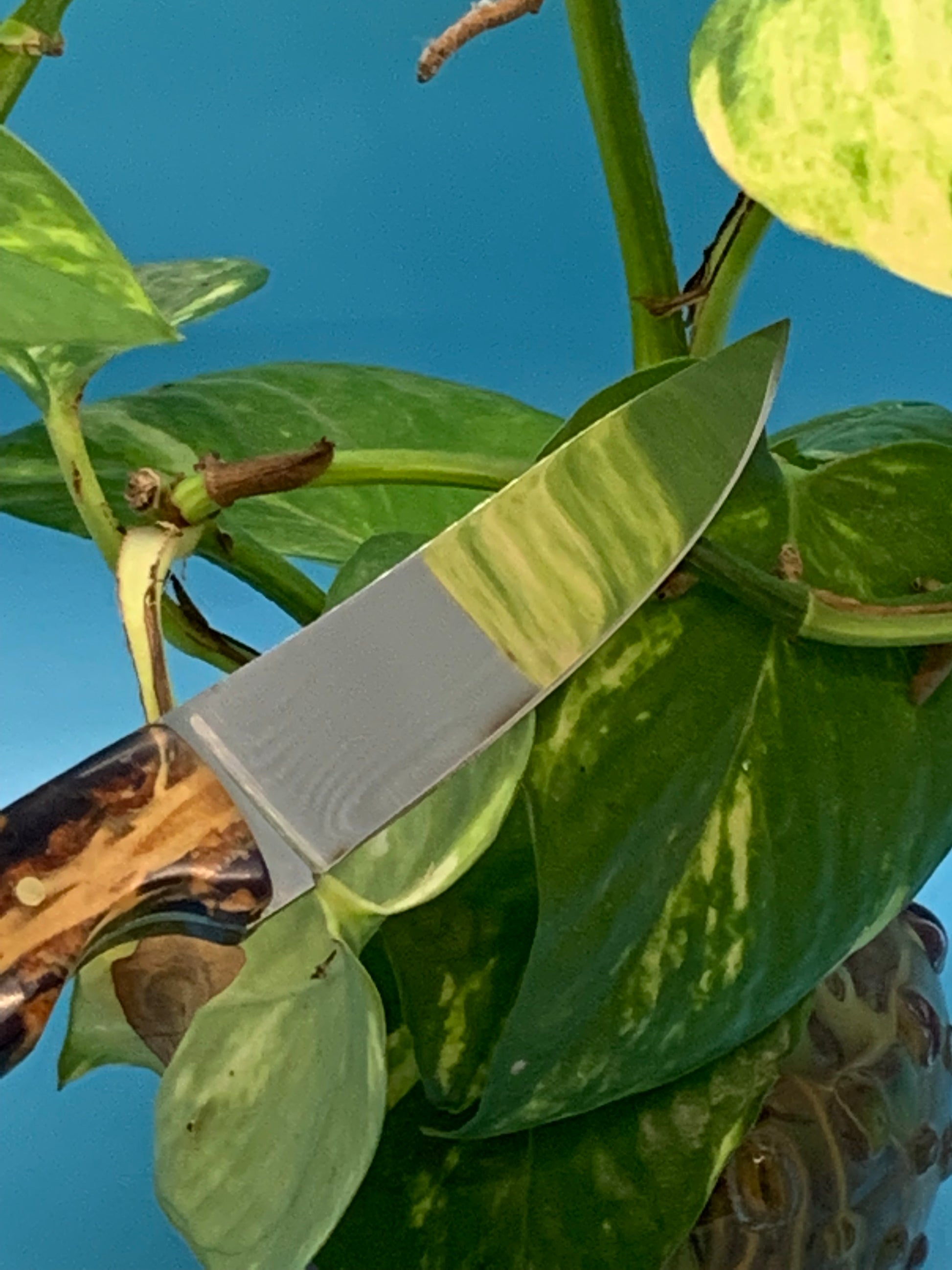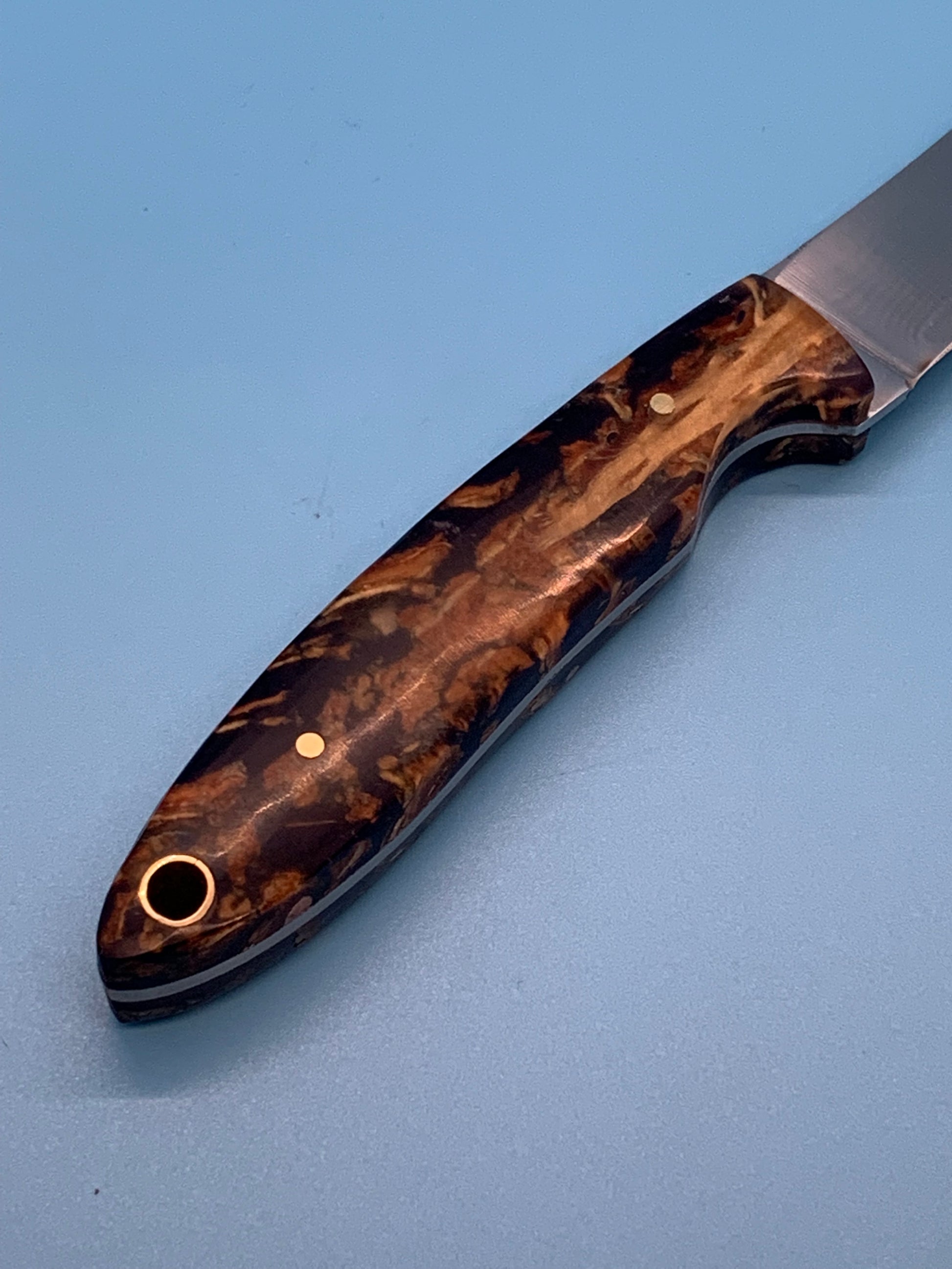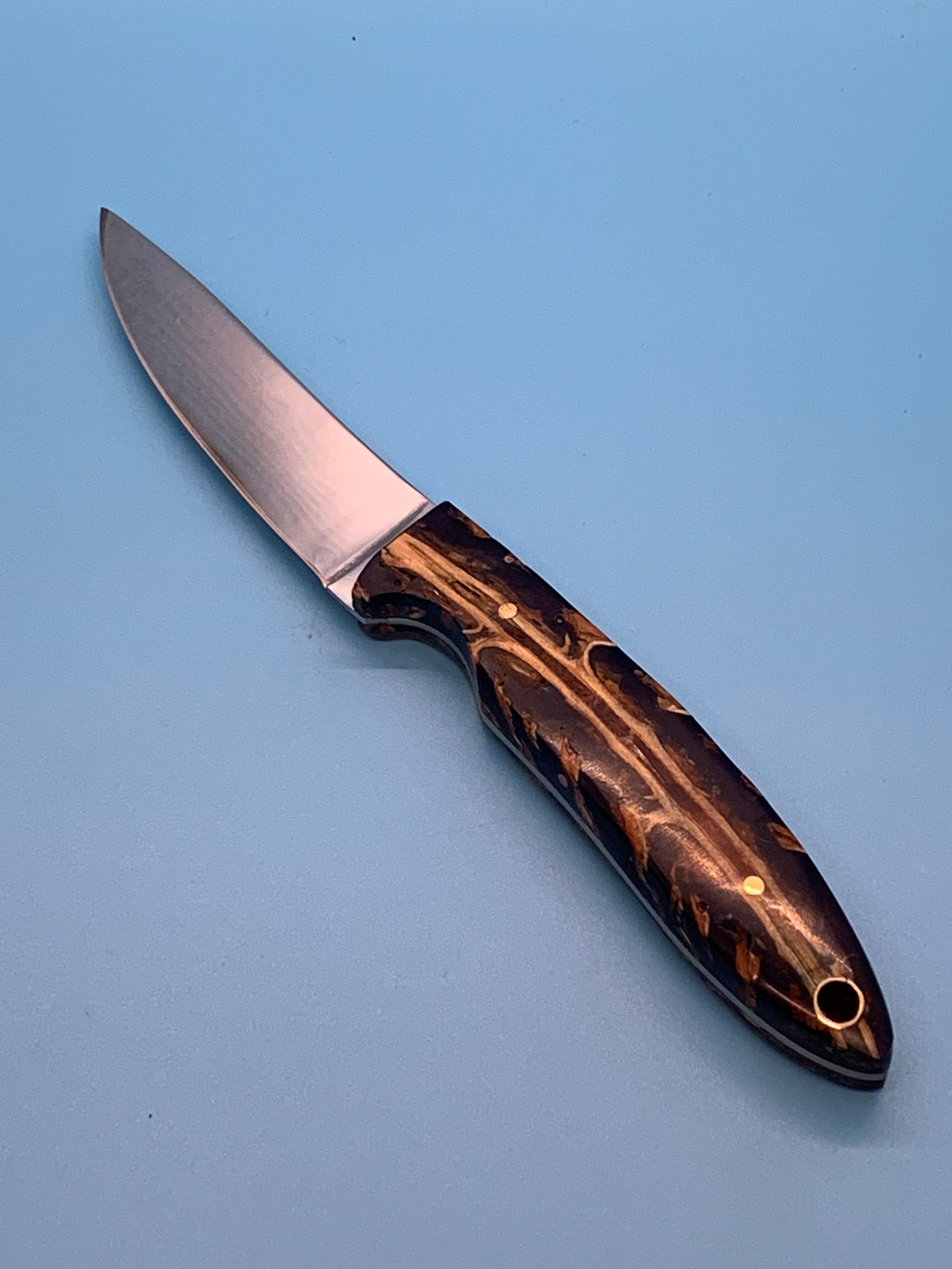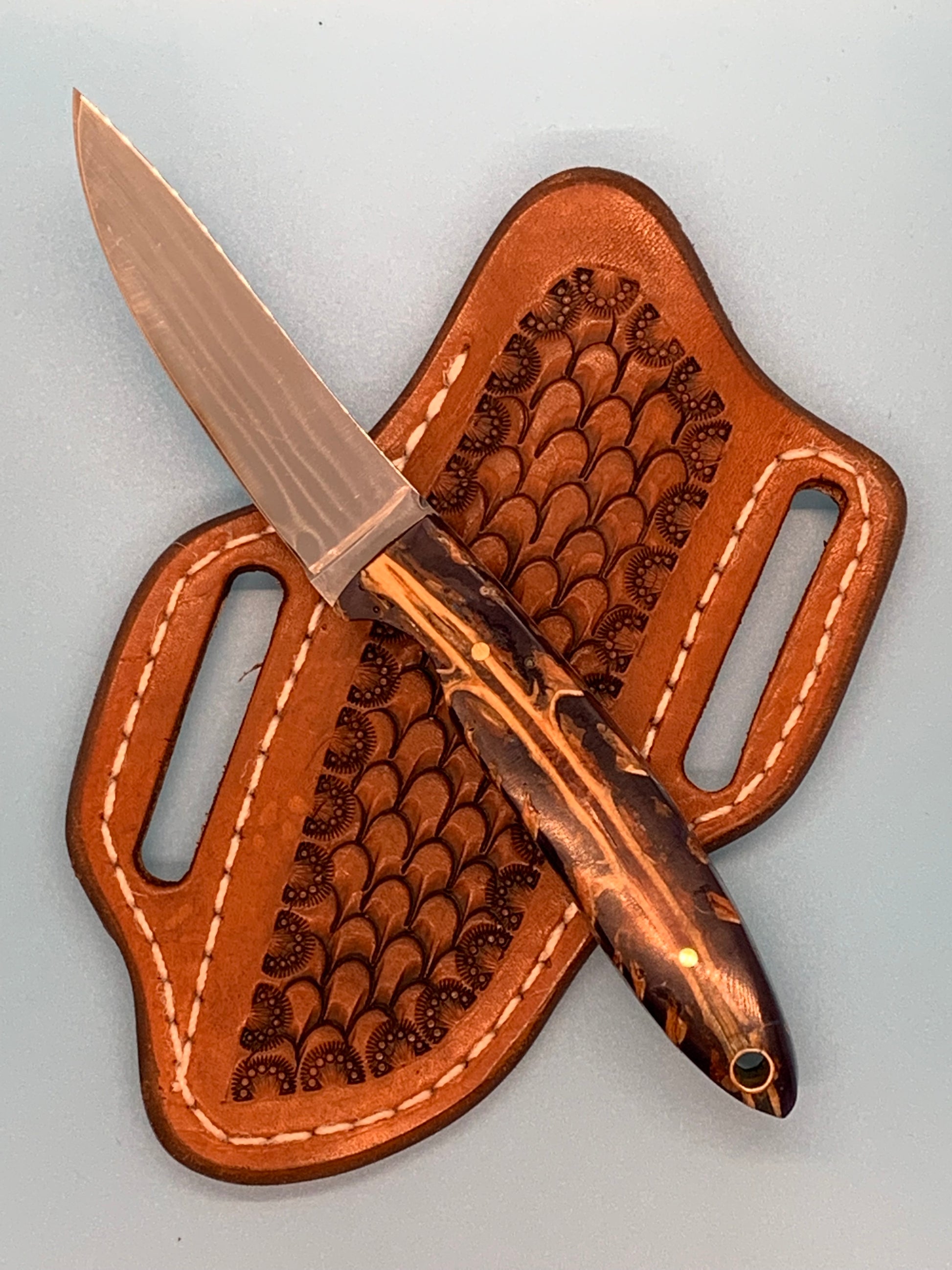 CEK custom designed and handcrafted this knife handle using pine cones that have been stabilized in blue resin epoxy. The handle measures just over 3.75 inches and supports a full tang blade with beautiful file work along the spine . The blade is made of D2 steel and measures 3.25 inches in length. Comes with this custom leather sheath.