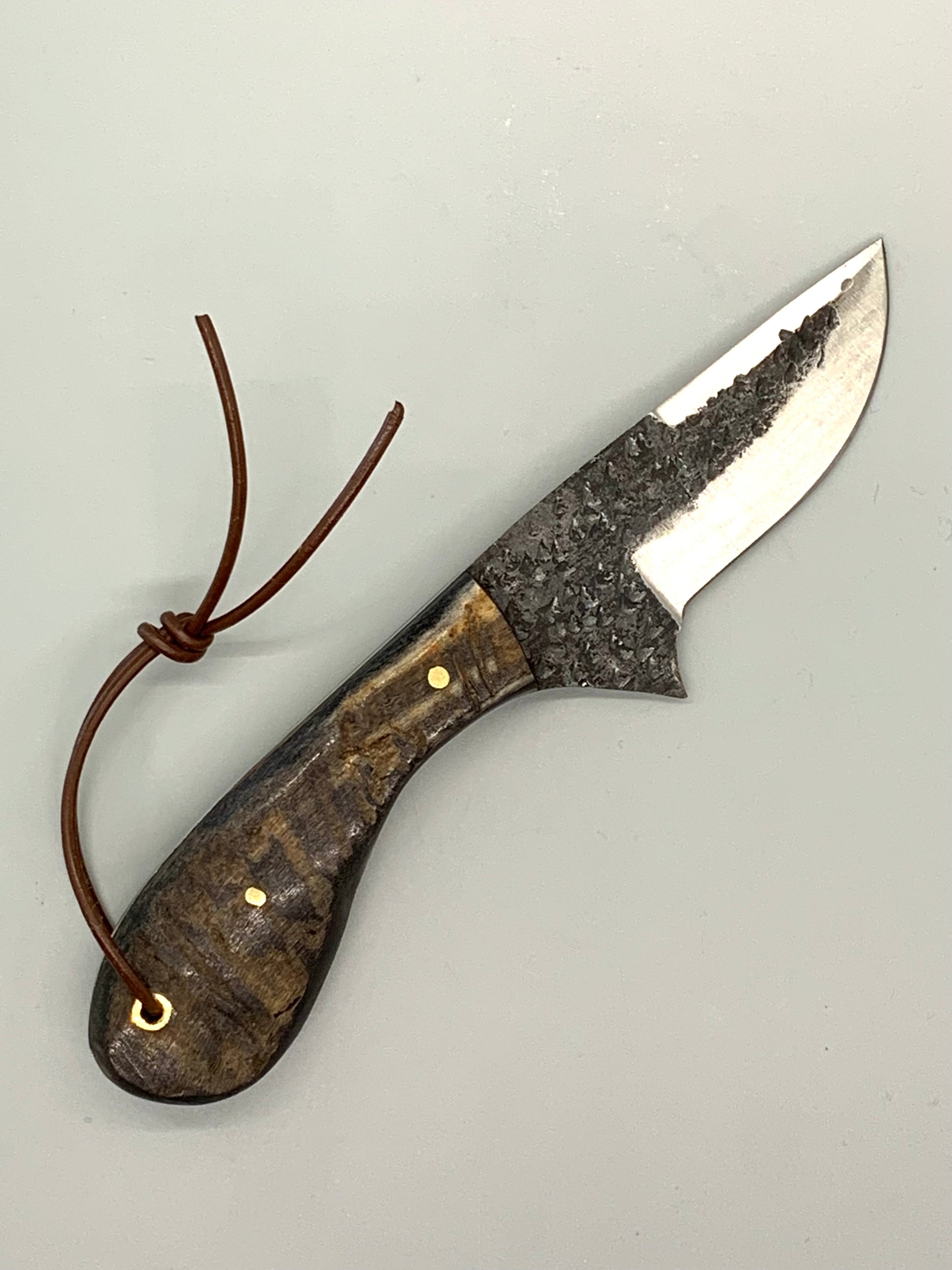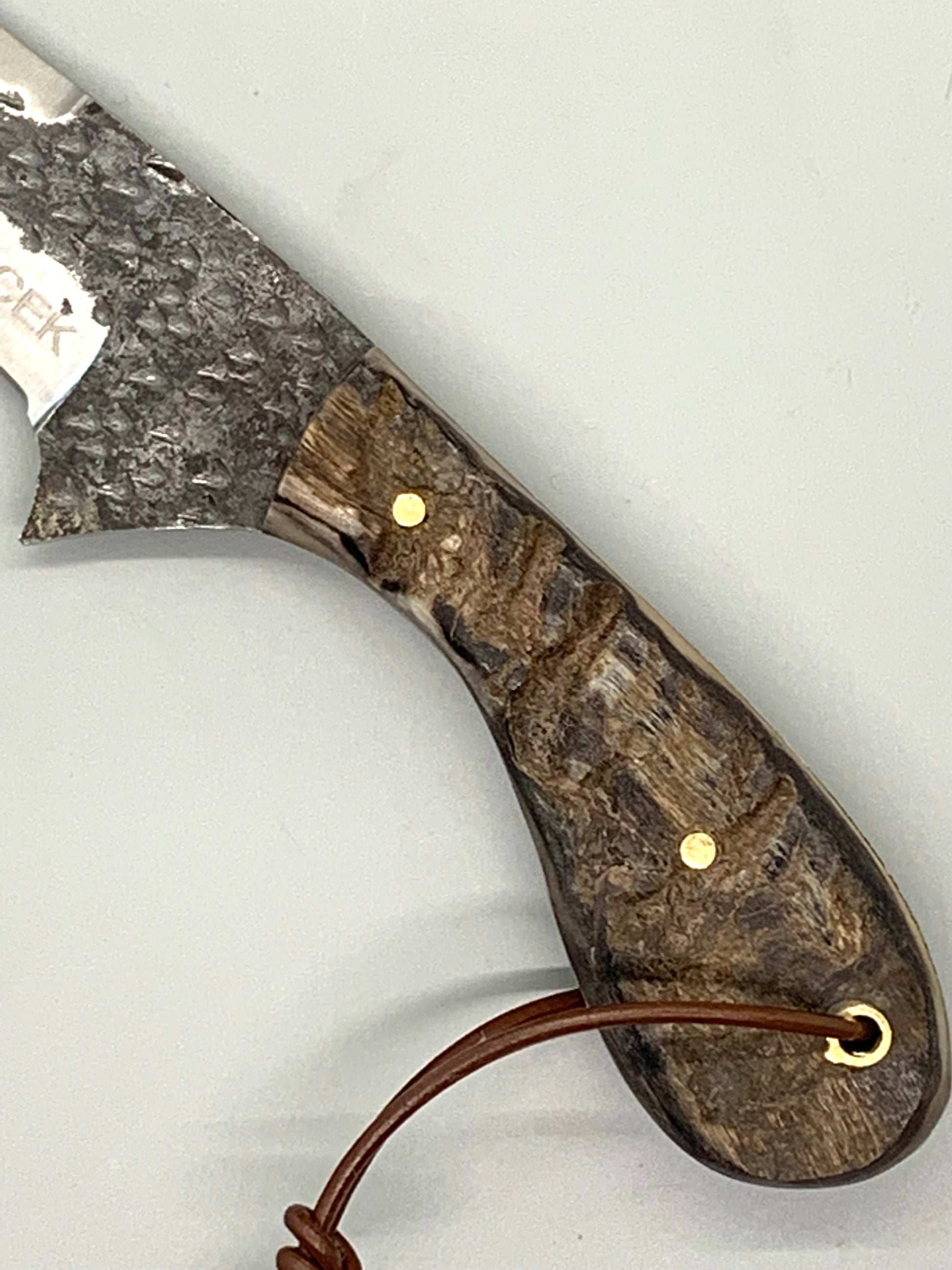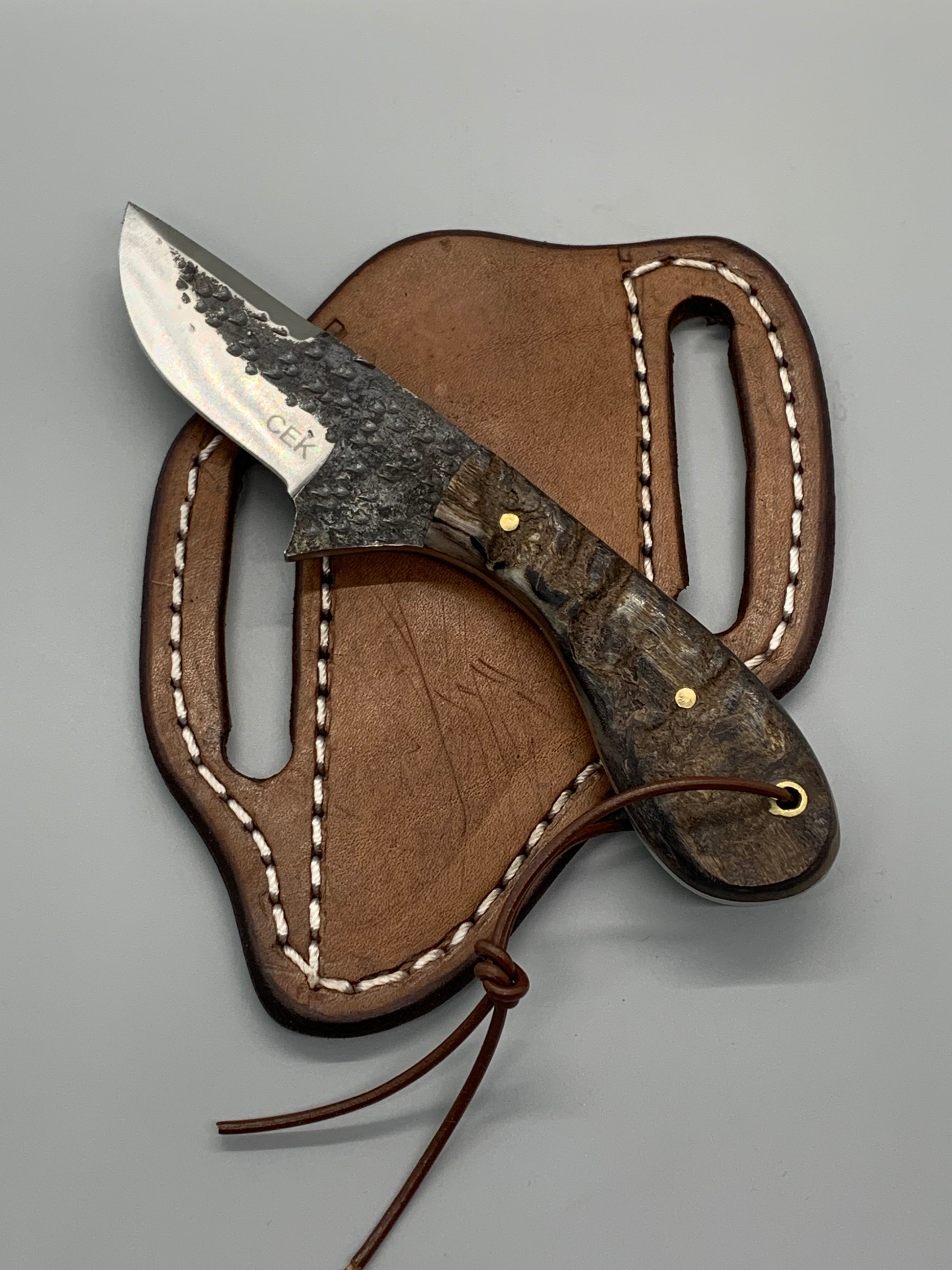 CEK custom designed and handcrafted this beautiful Ram horn handle that measures just over 3 inches in length. This handle supports a full tang, hammered D2 steel blade and measures slightly under 3" (by maybe an 1/8th of an inch).